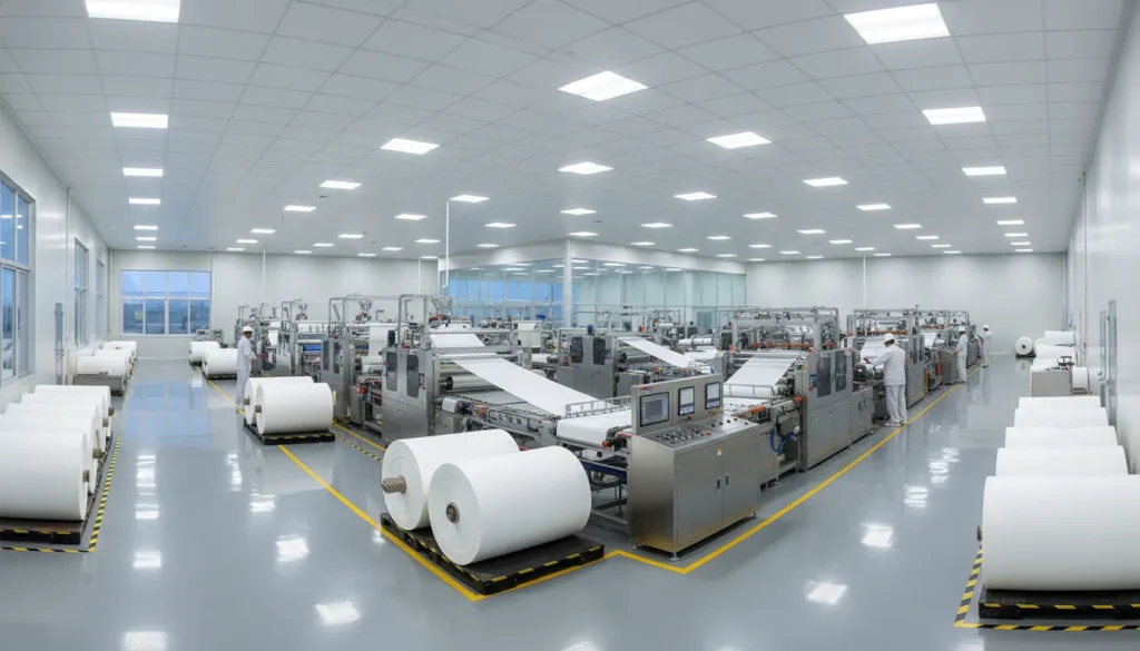 Real-life scene of a modern nonwoven fabric source factory production workshop.